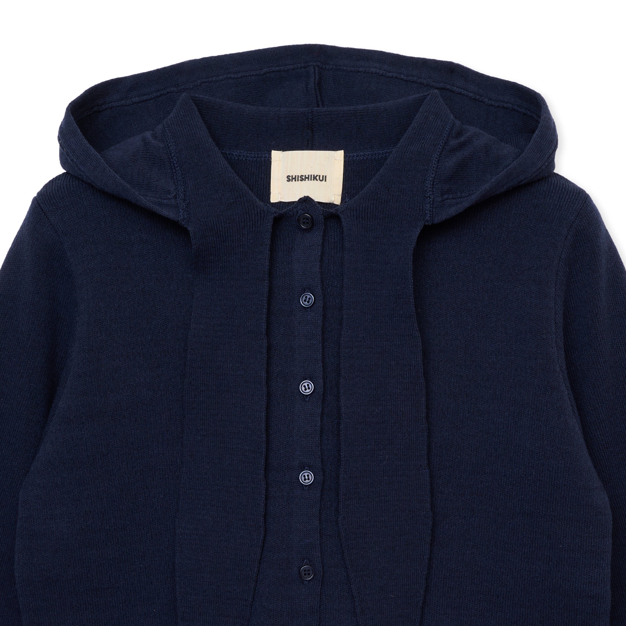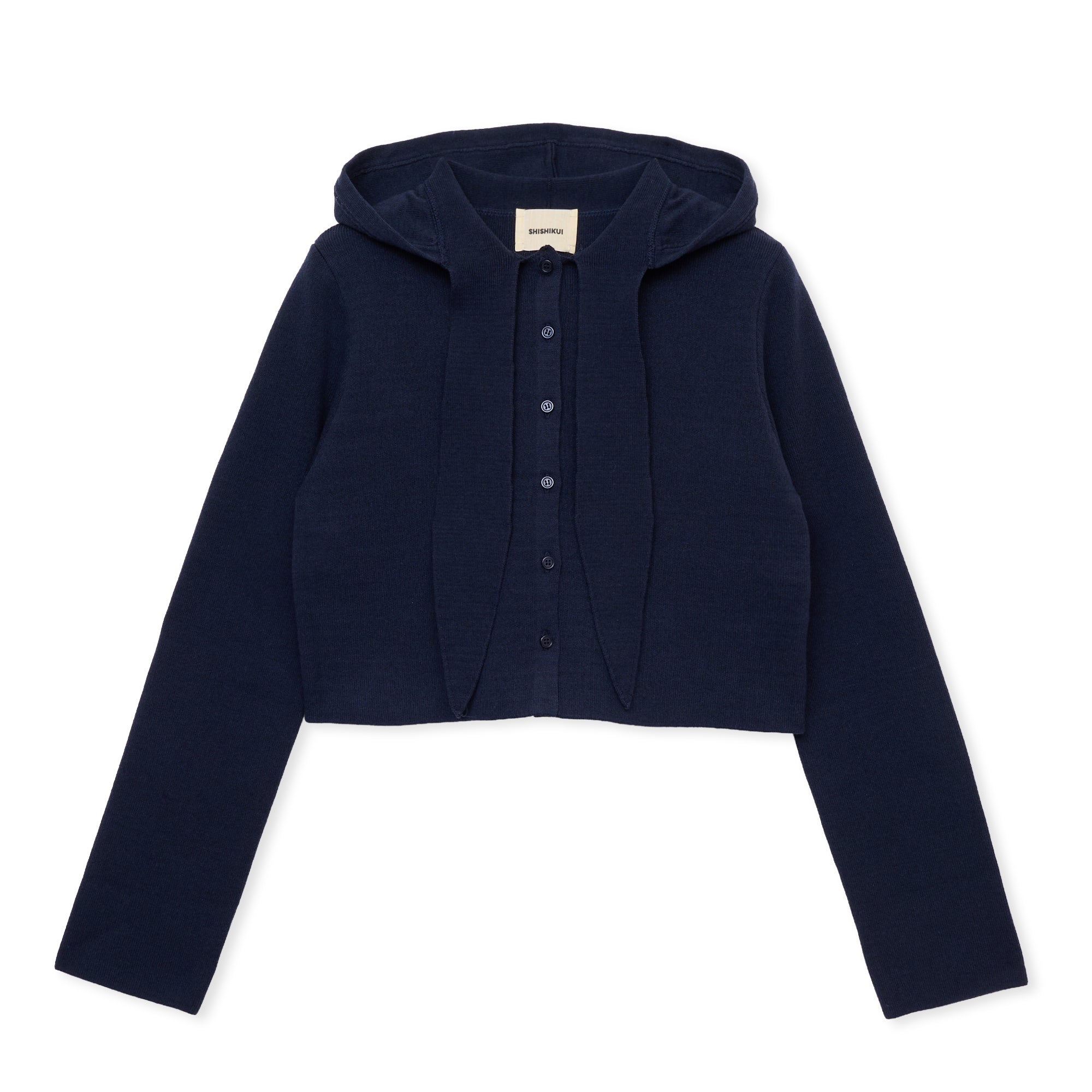 フード&棒タイ付きデザインのニットカーディガン。