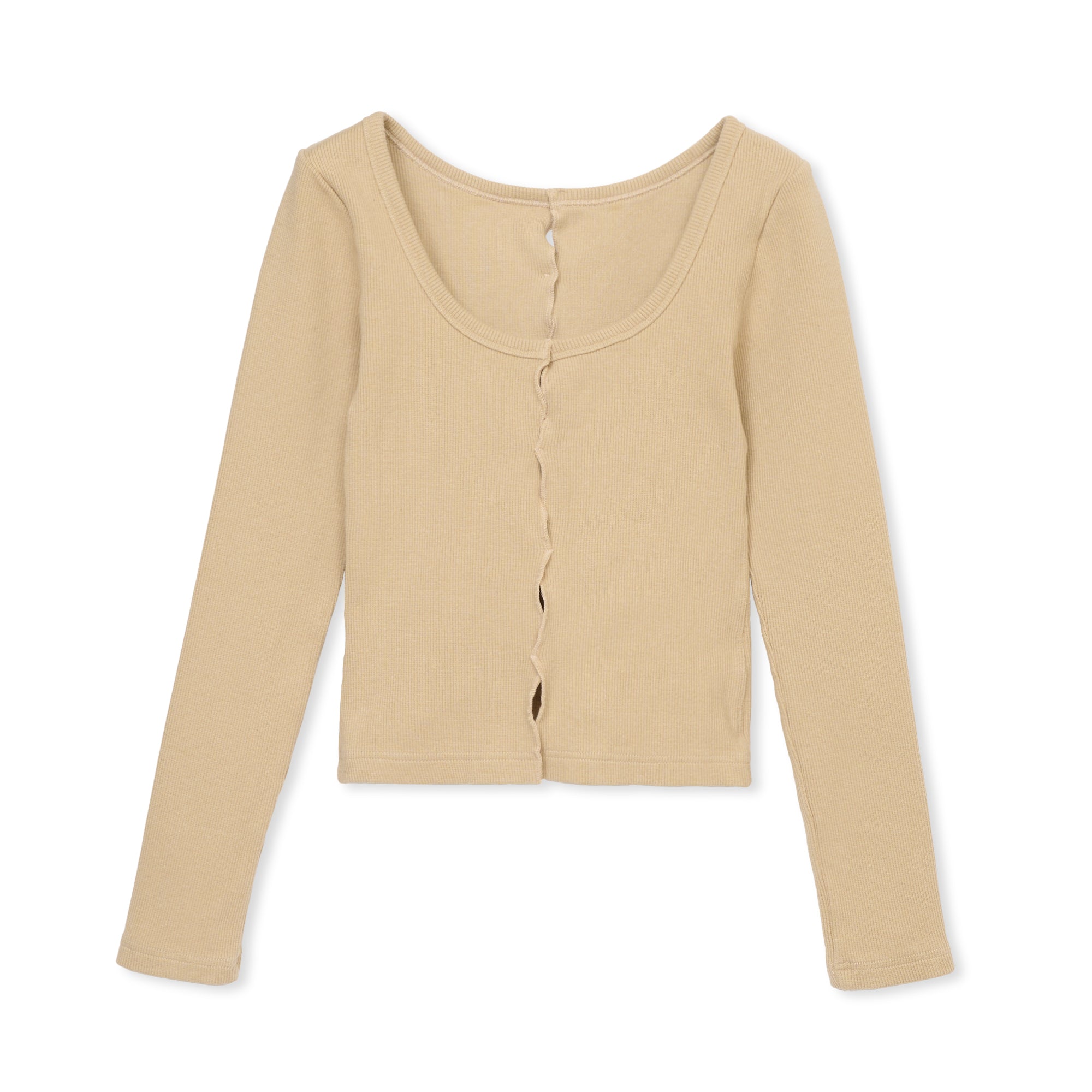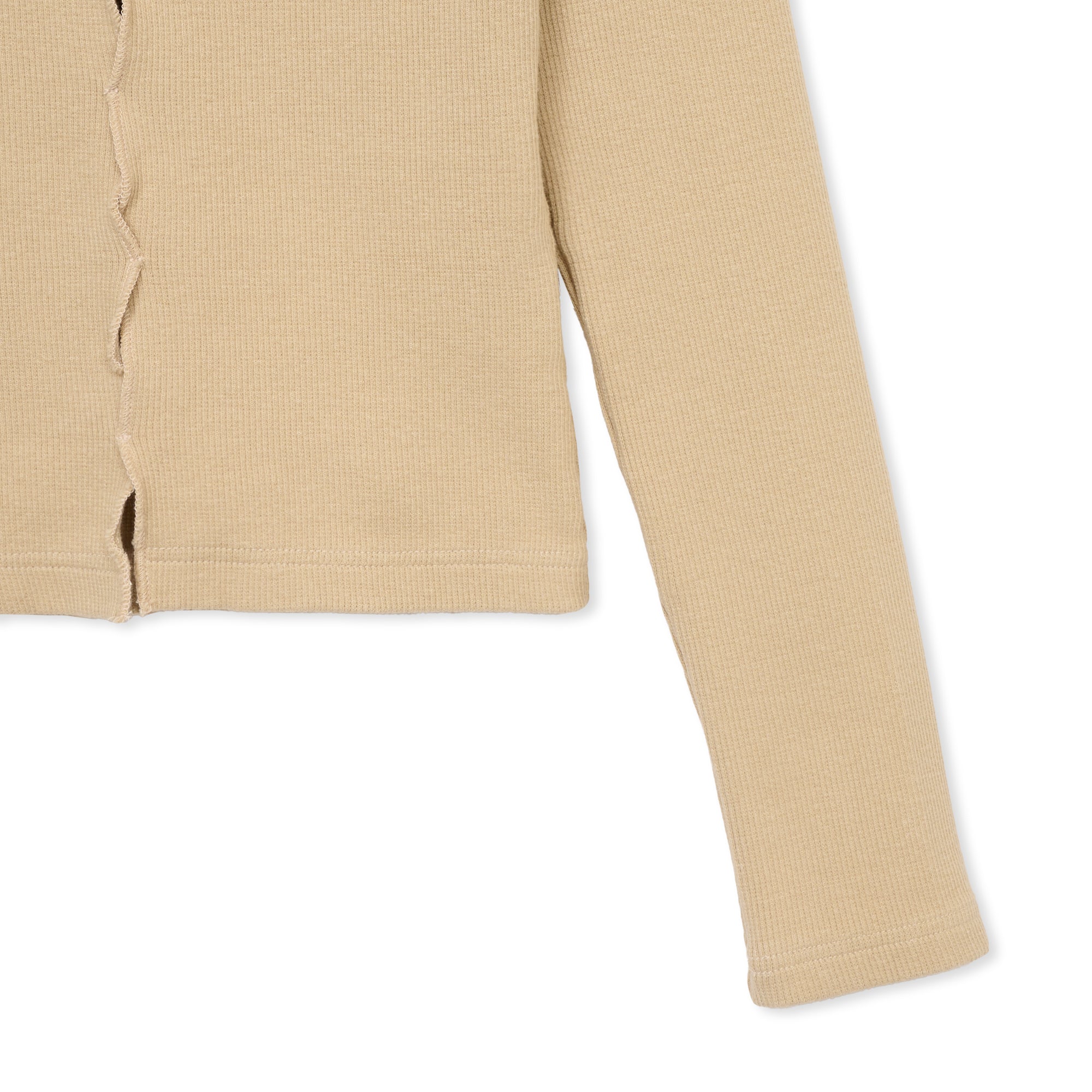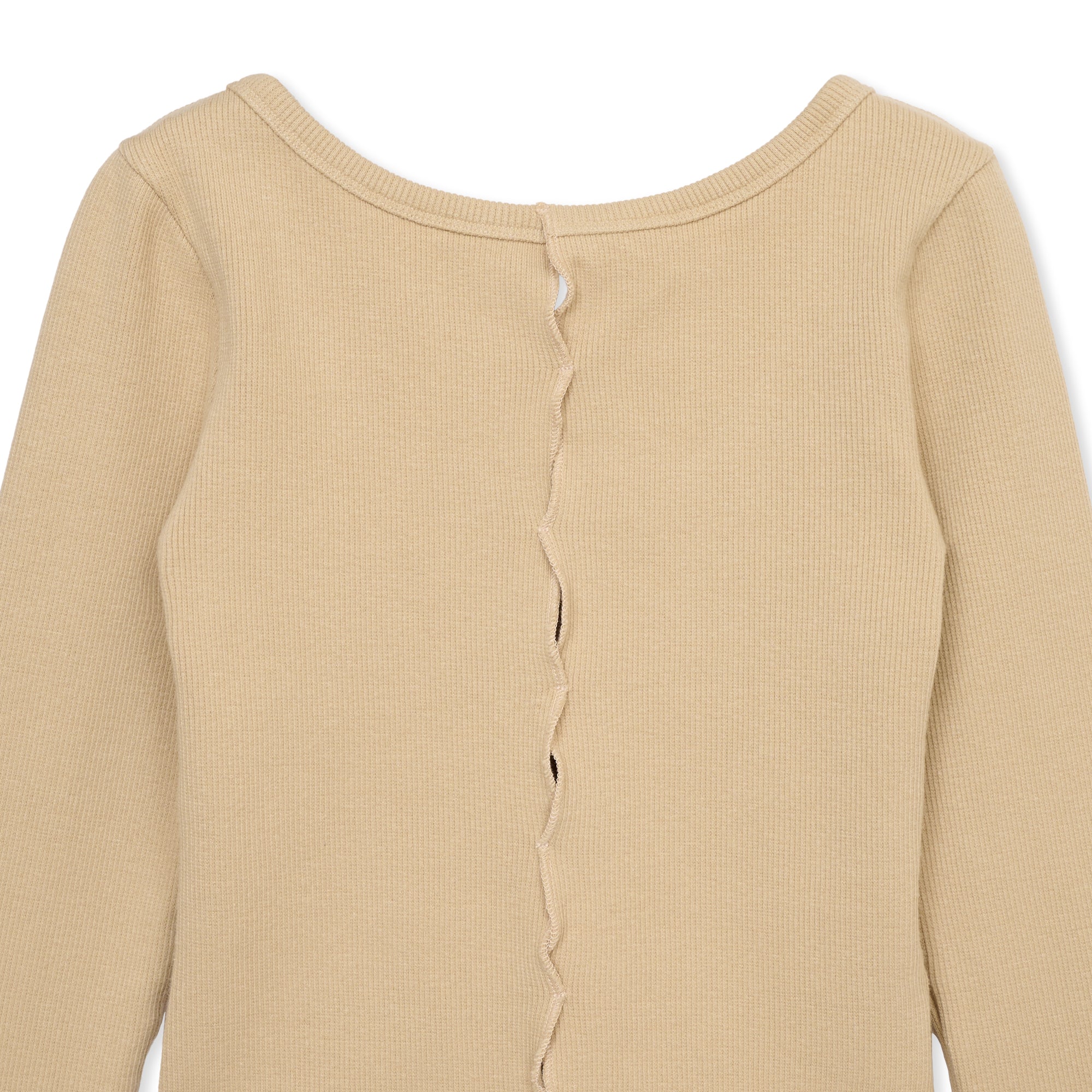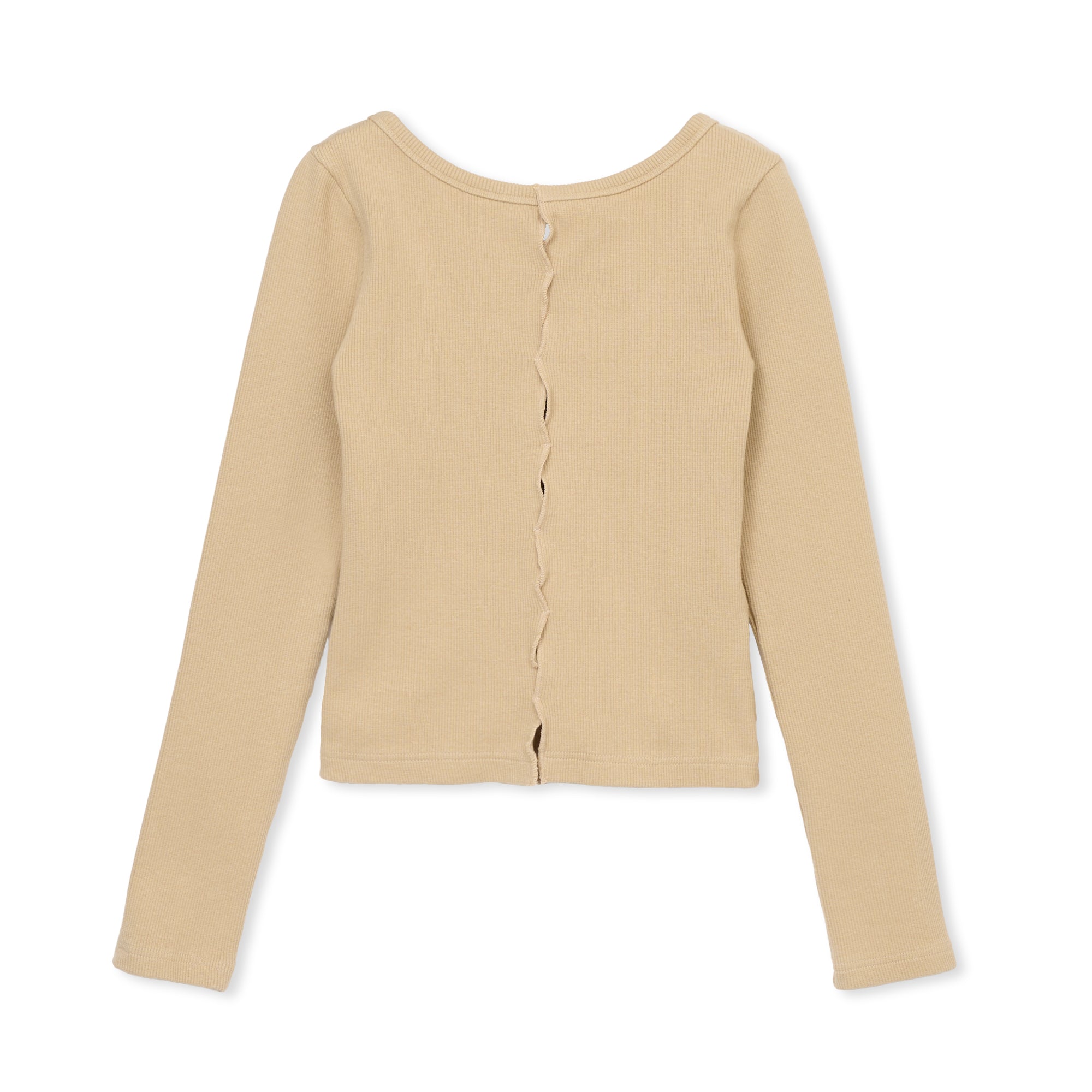 前見頃・後ろ見頃にカッティングデザインを施したトップス。前後どちらでもご着用いただけます。硬めの細畝リブ生地を使用しています。【サイズ】Free着丈:約45cm身幅:約31cm袖丈:約59cm *伸縮性のある素材の為多少の誤差はご了承ください。