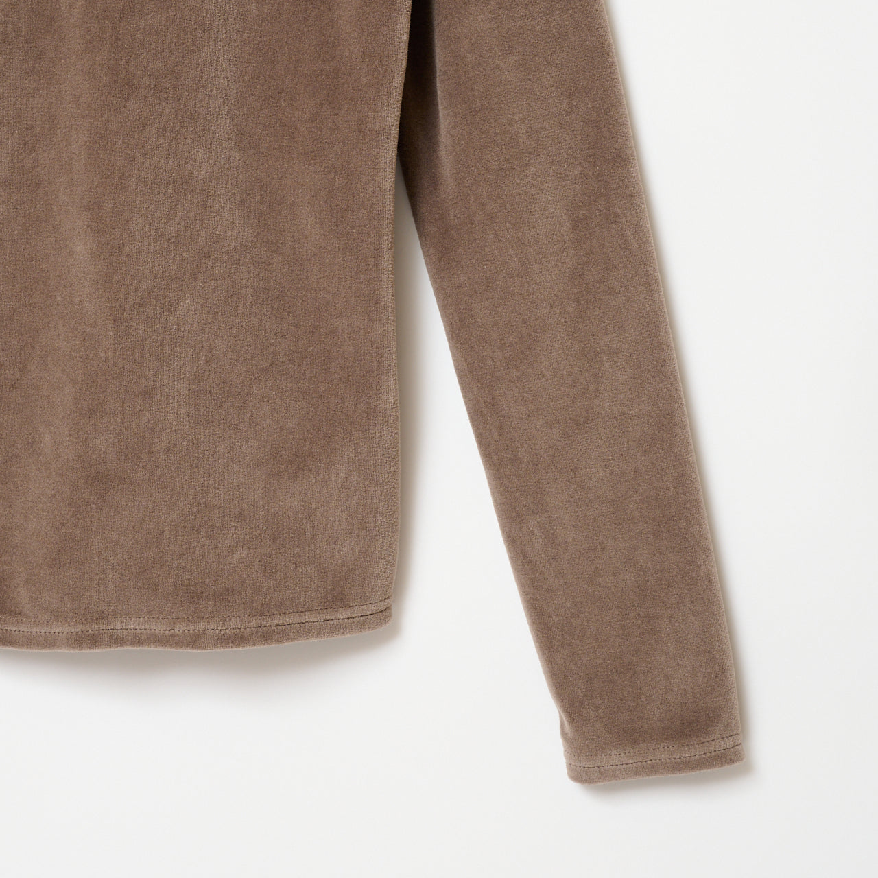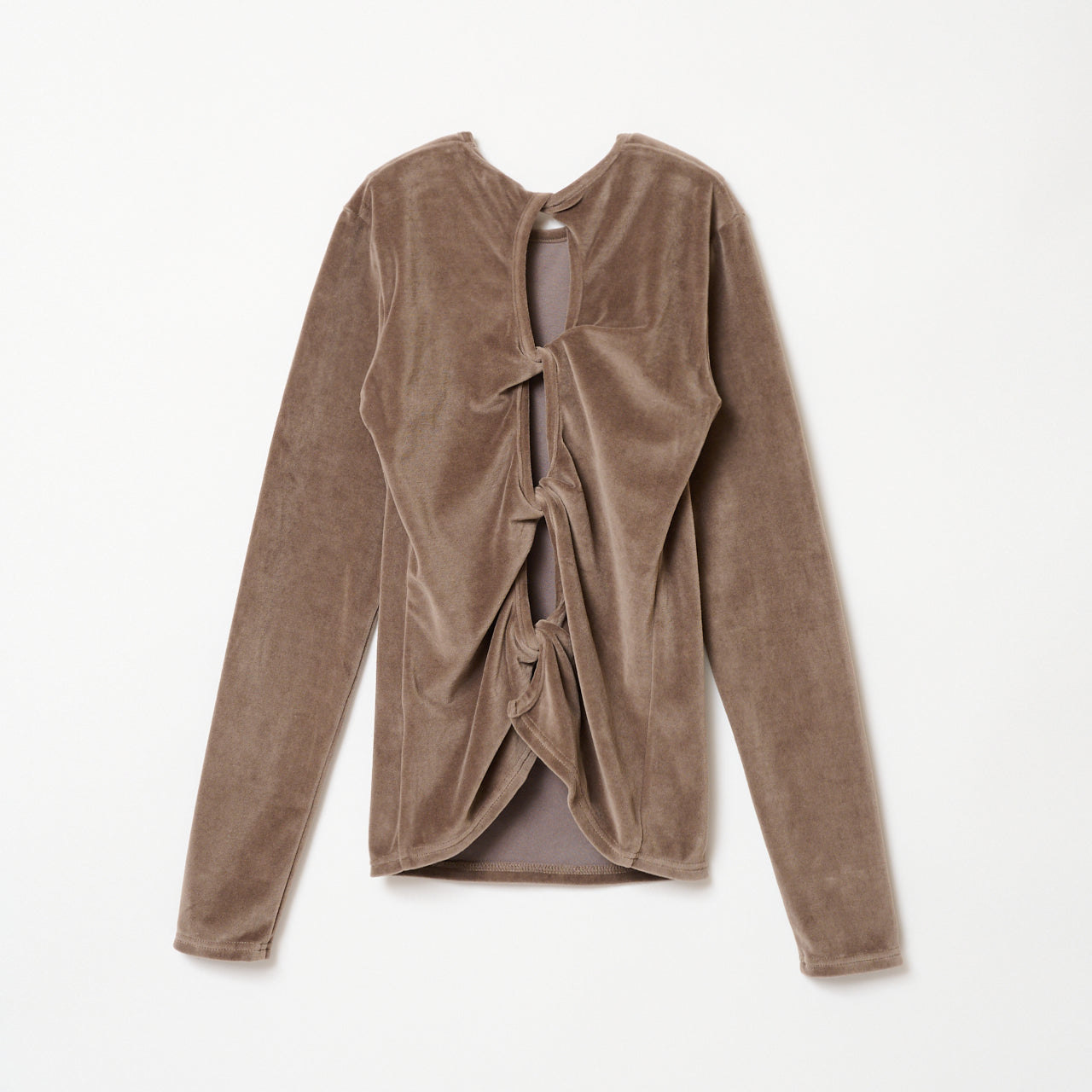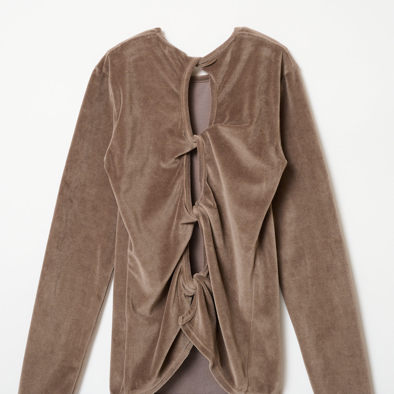 ベロア生地を使用したツイストデザインのロングスリーブカットソー。