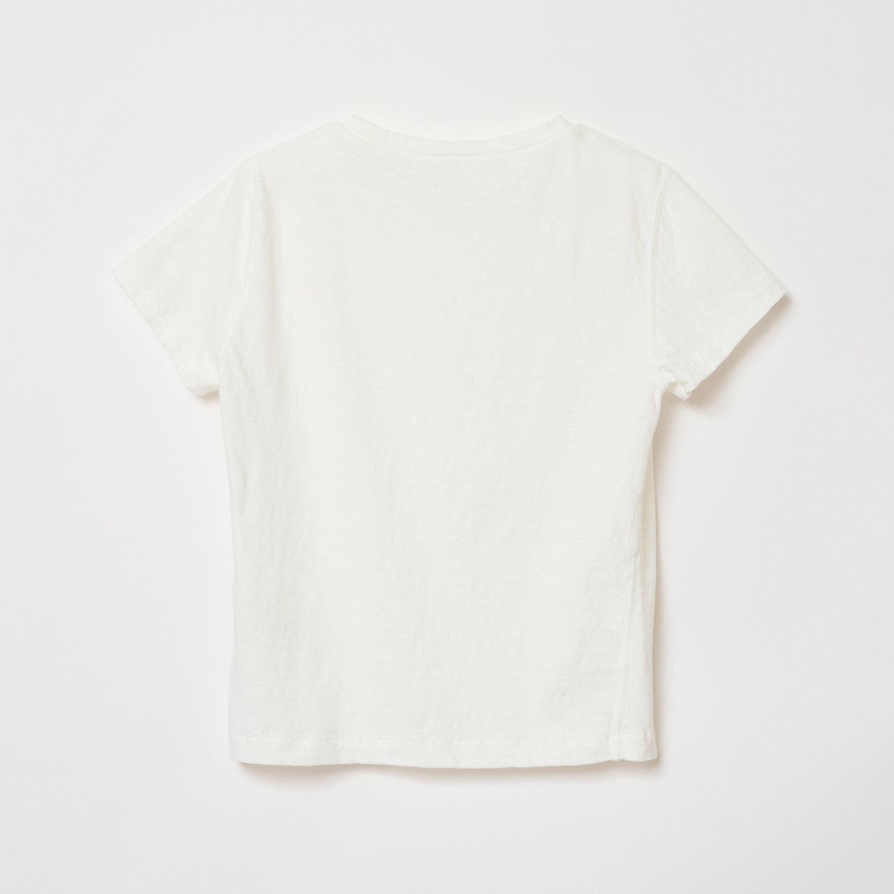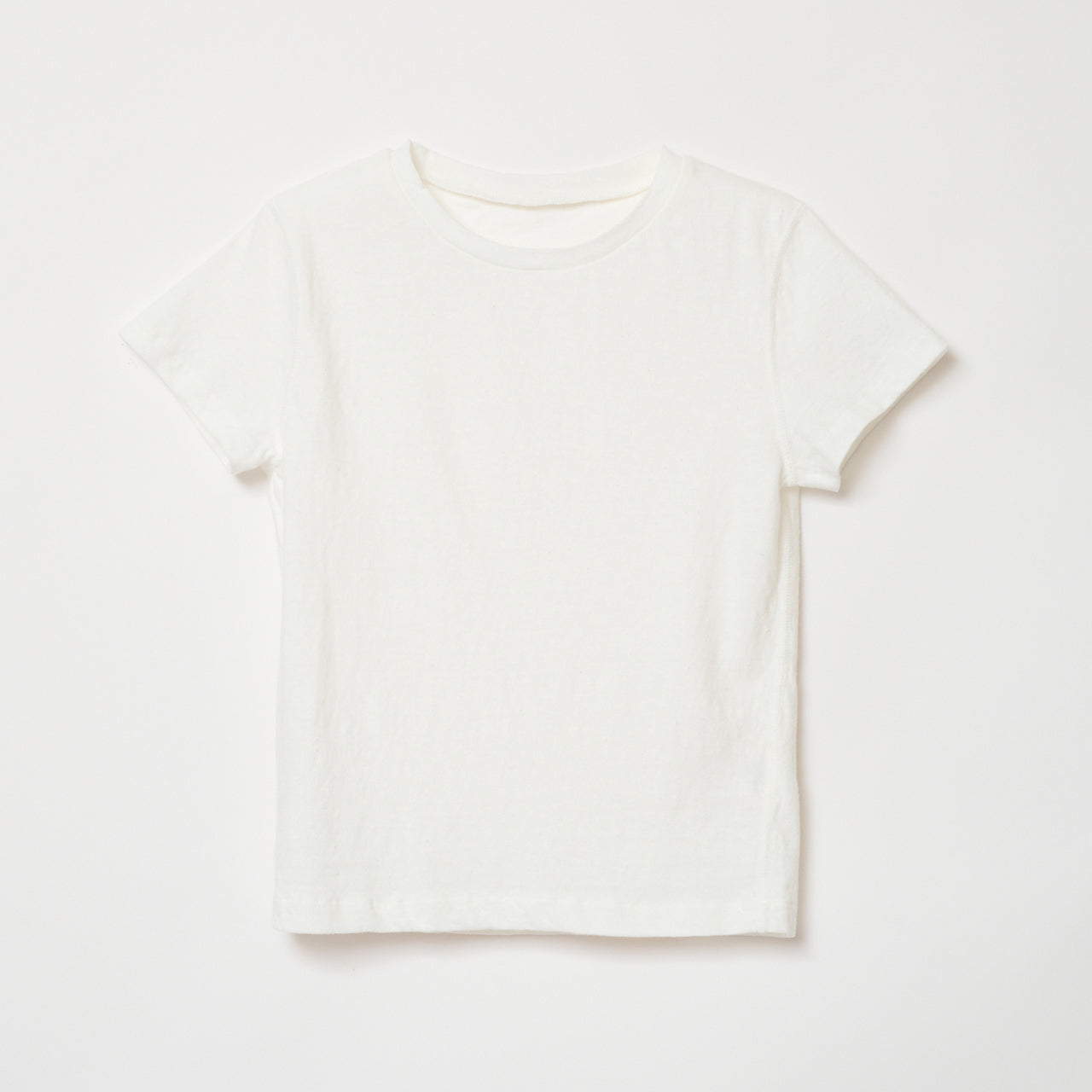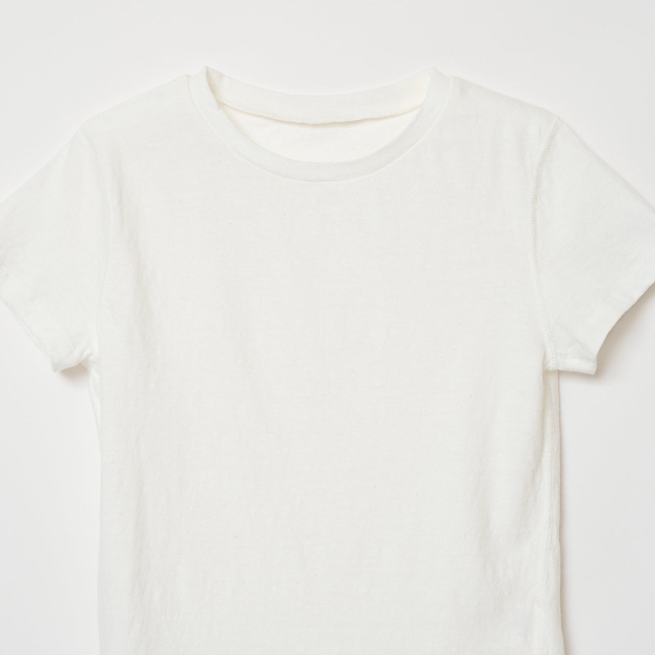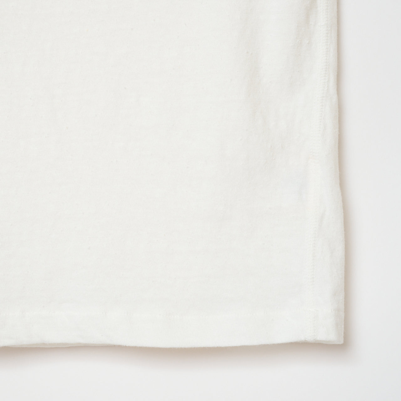 繊維の束が含まれた凹凸のあるネップ糸で織った別注生地を使用したTシャツ。全体にぽつぽつとしたネップが含まれることで生地表面に立体感が生まれます。
