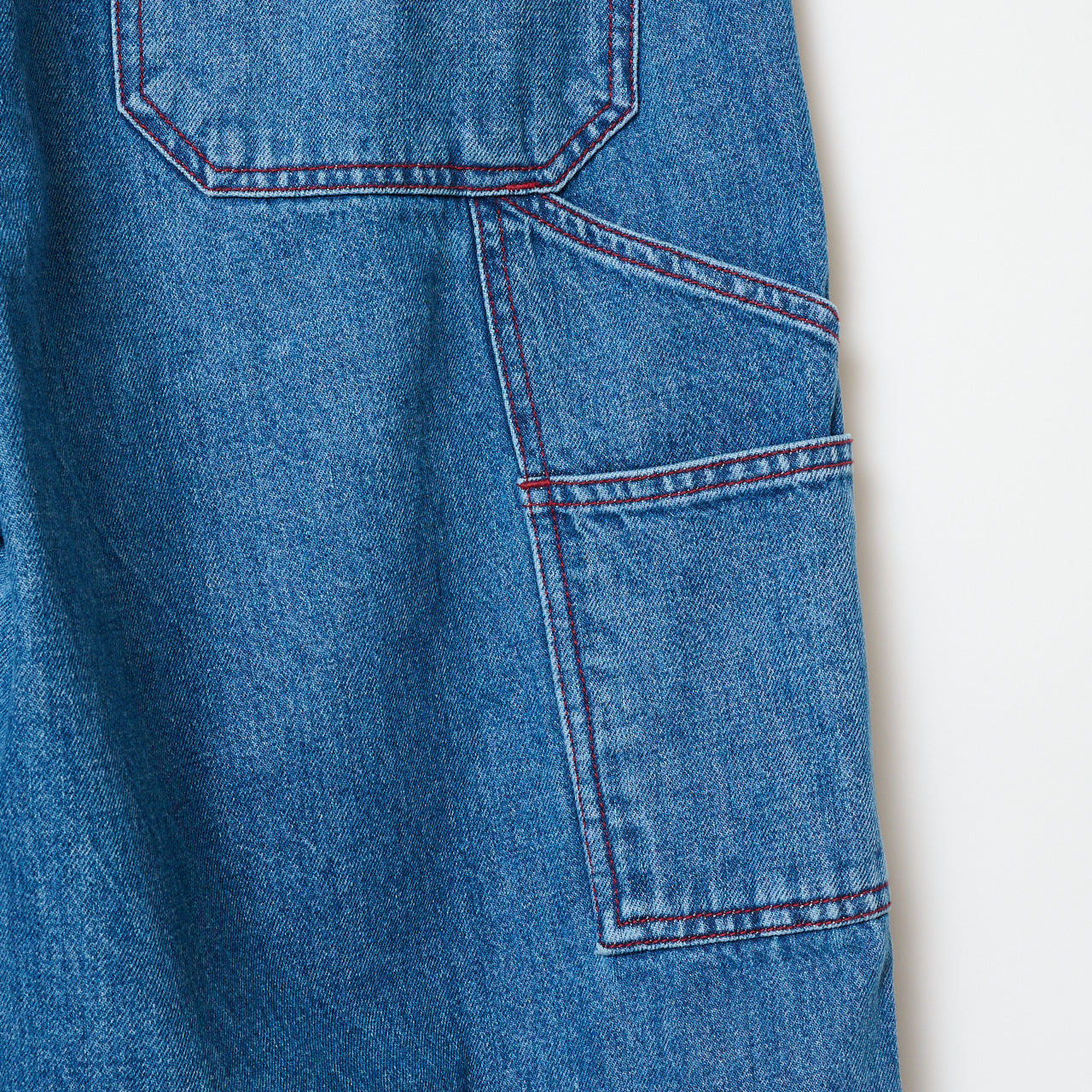 ワークパンツのデザインの特徴であるツールポケットや大きなワークポケット施したデニム生地のペインターパンツ。