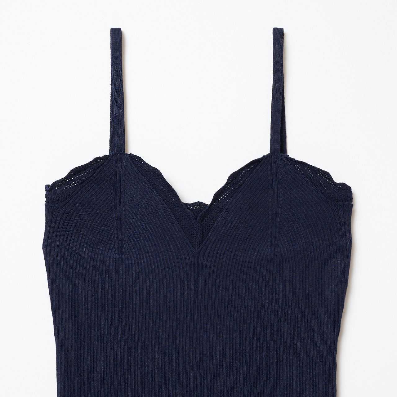 胸元に編み地でフリルを施したリブニットキャミソール。