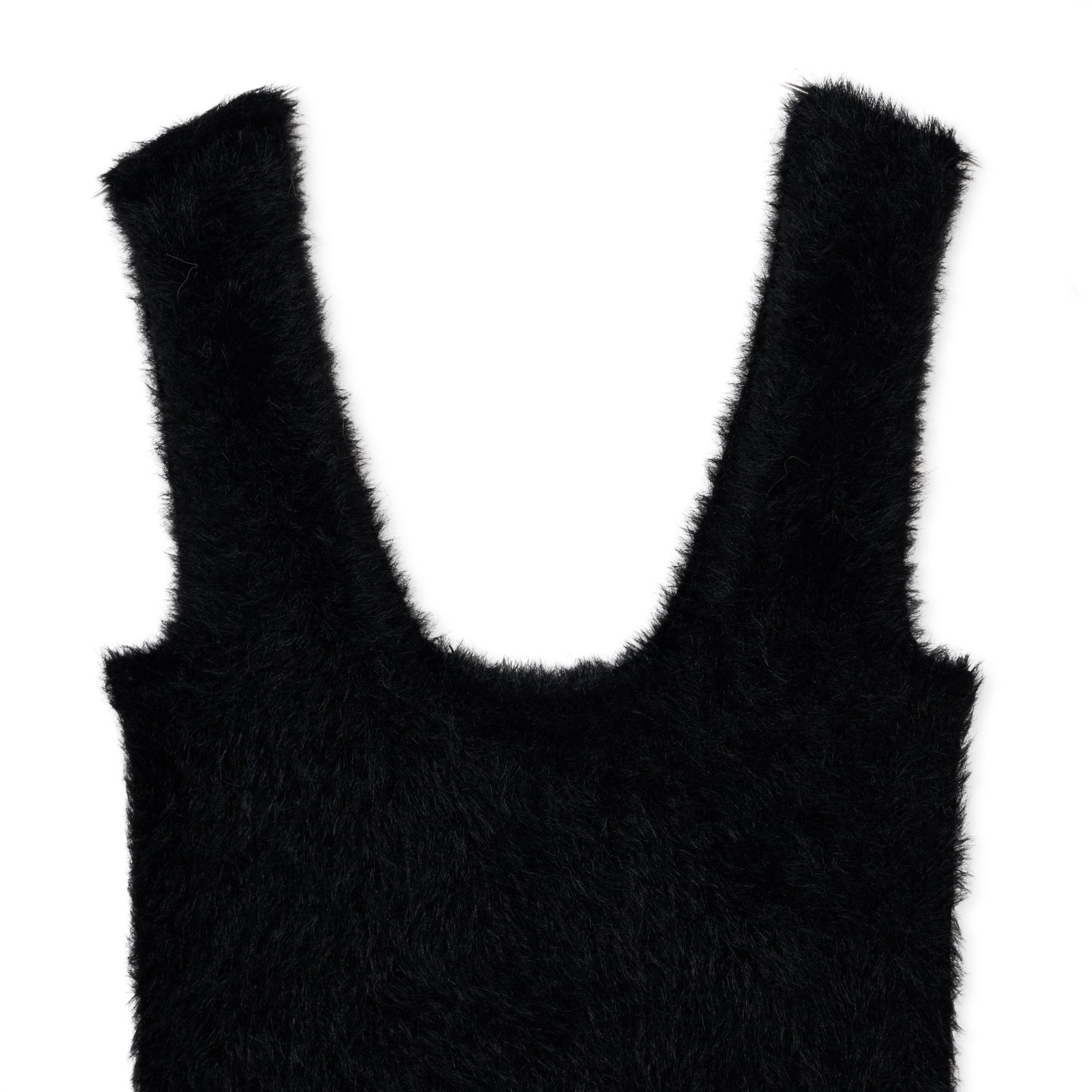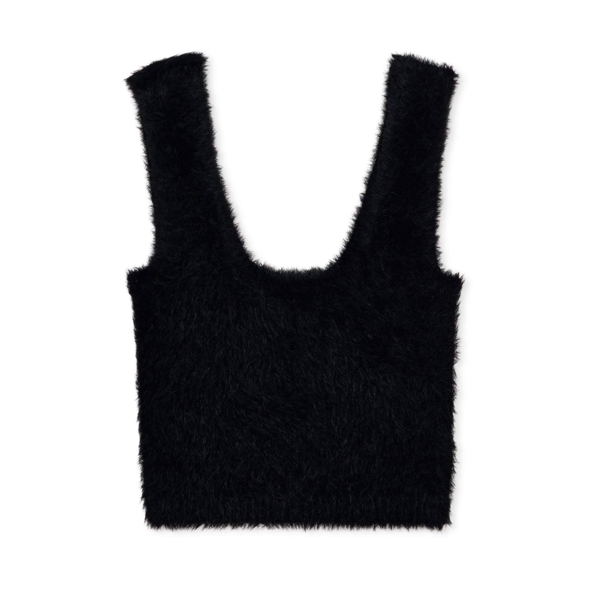 毛足の長いウールミックス糸を編み込んだスクエア型ノースリーブトップスです。