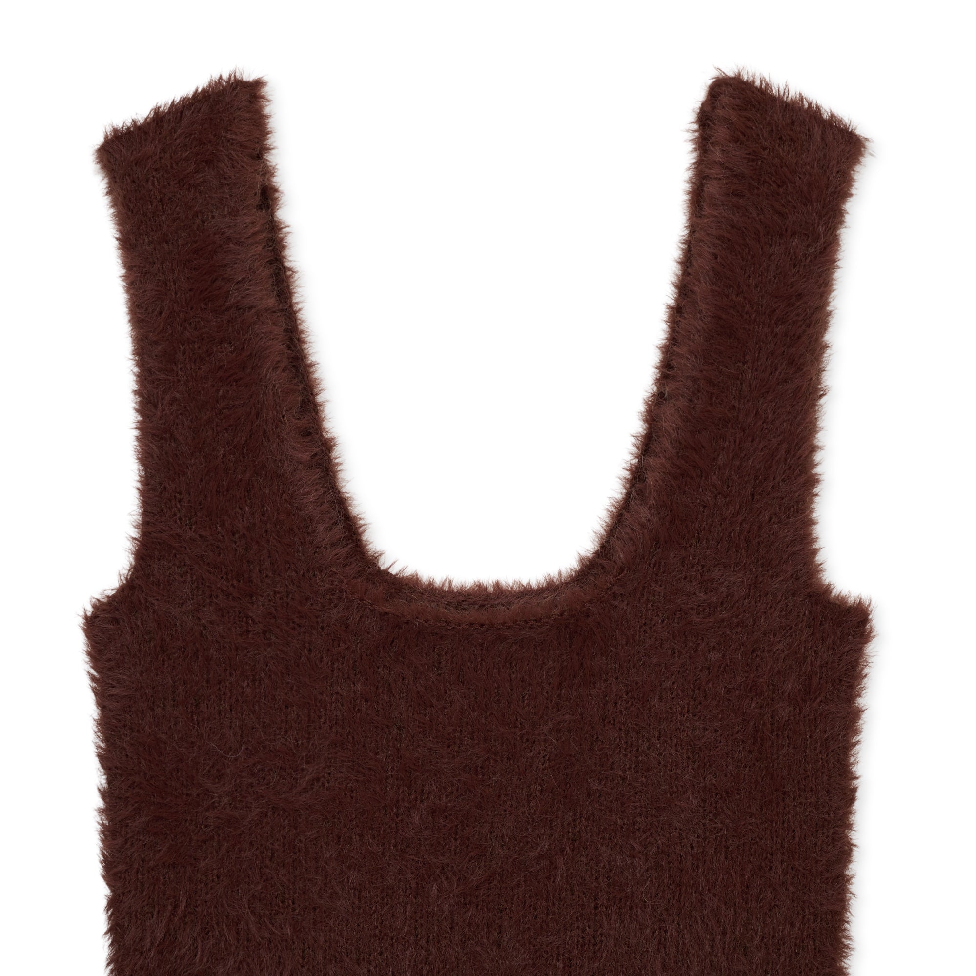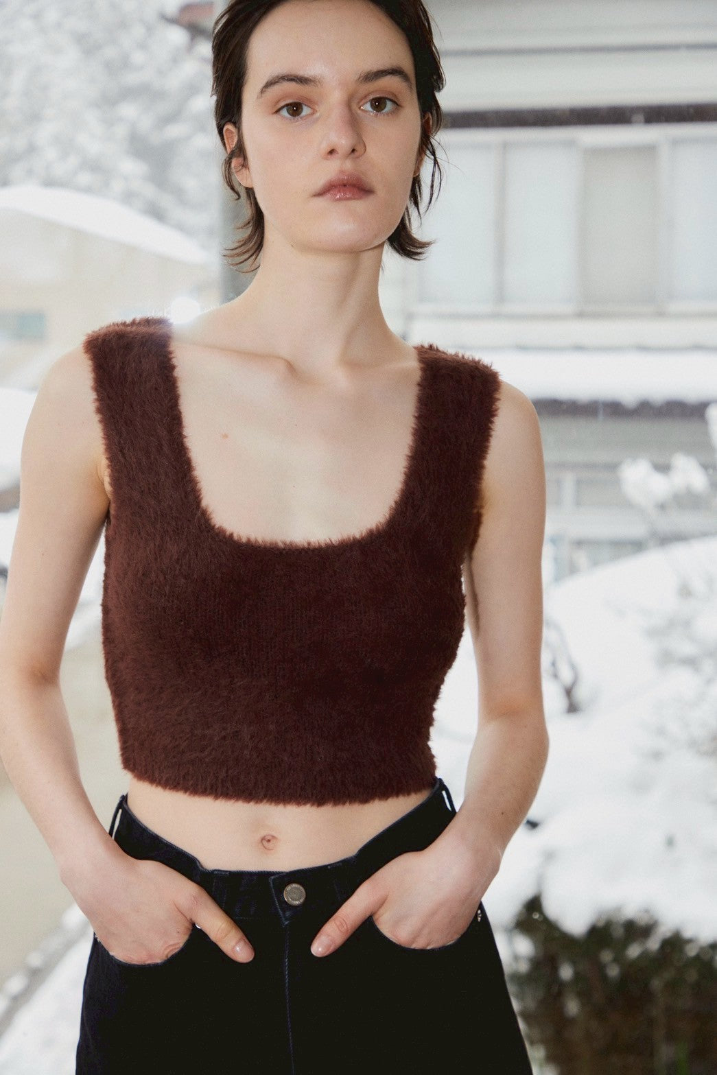 毛足の長いウールミックス糸を編み込んだスクエア型ノースリーブトップスです。