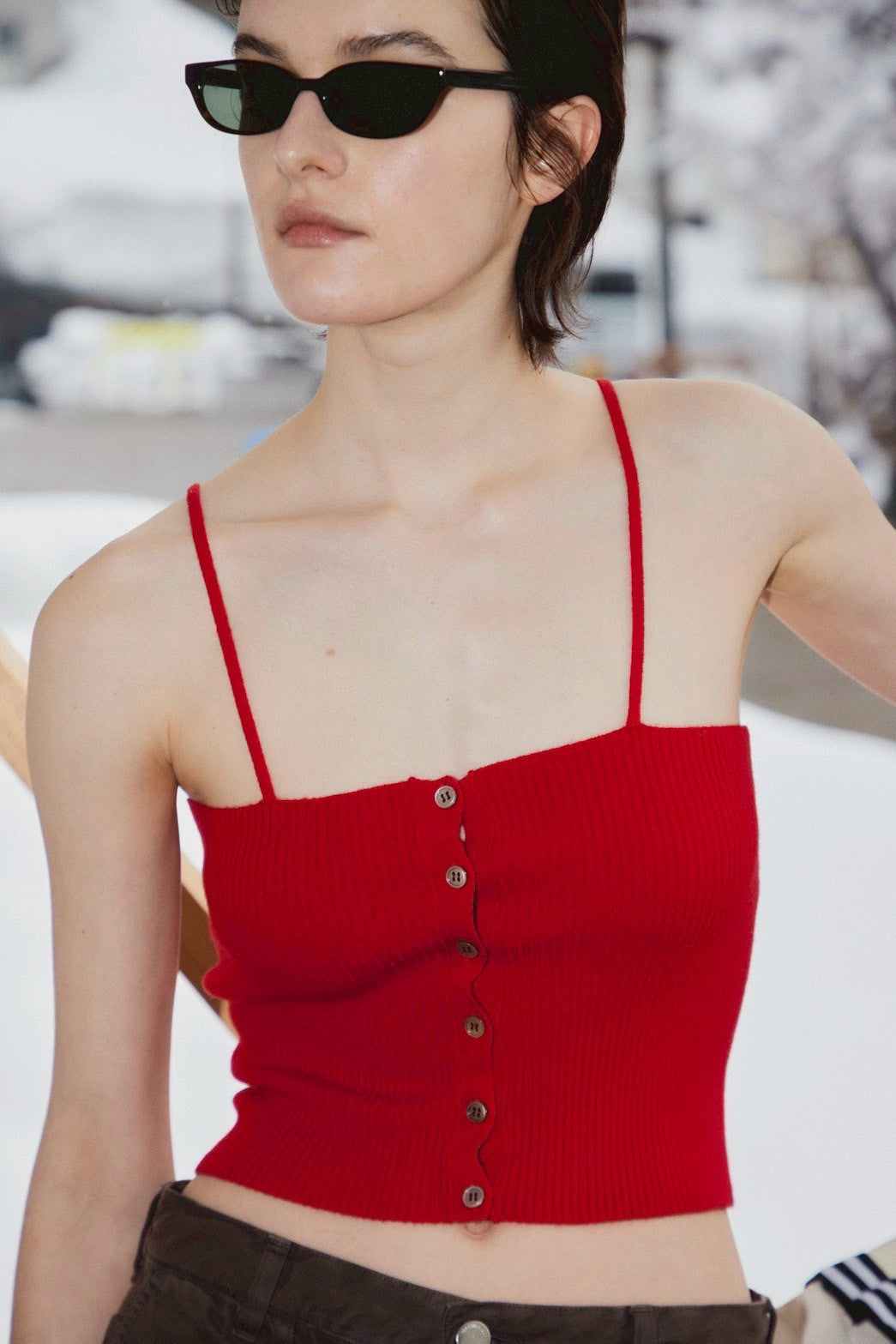 ベアトップ型ニットキャミソール。