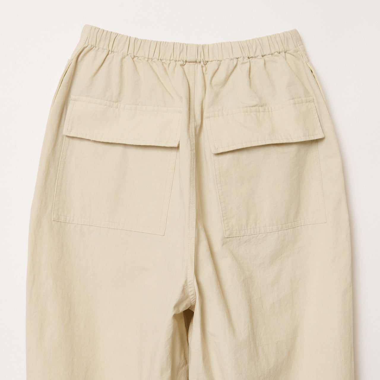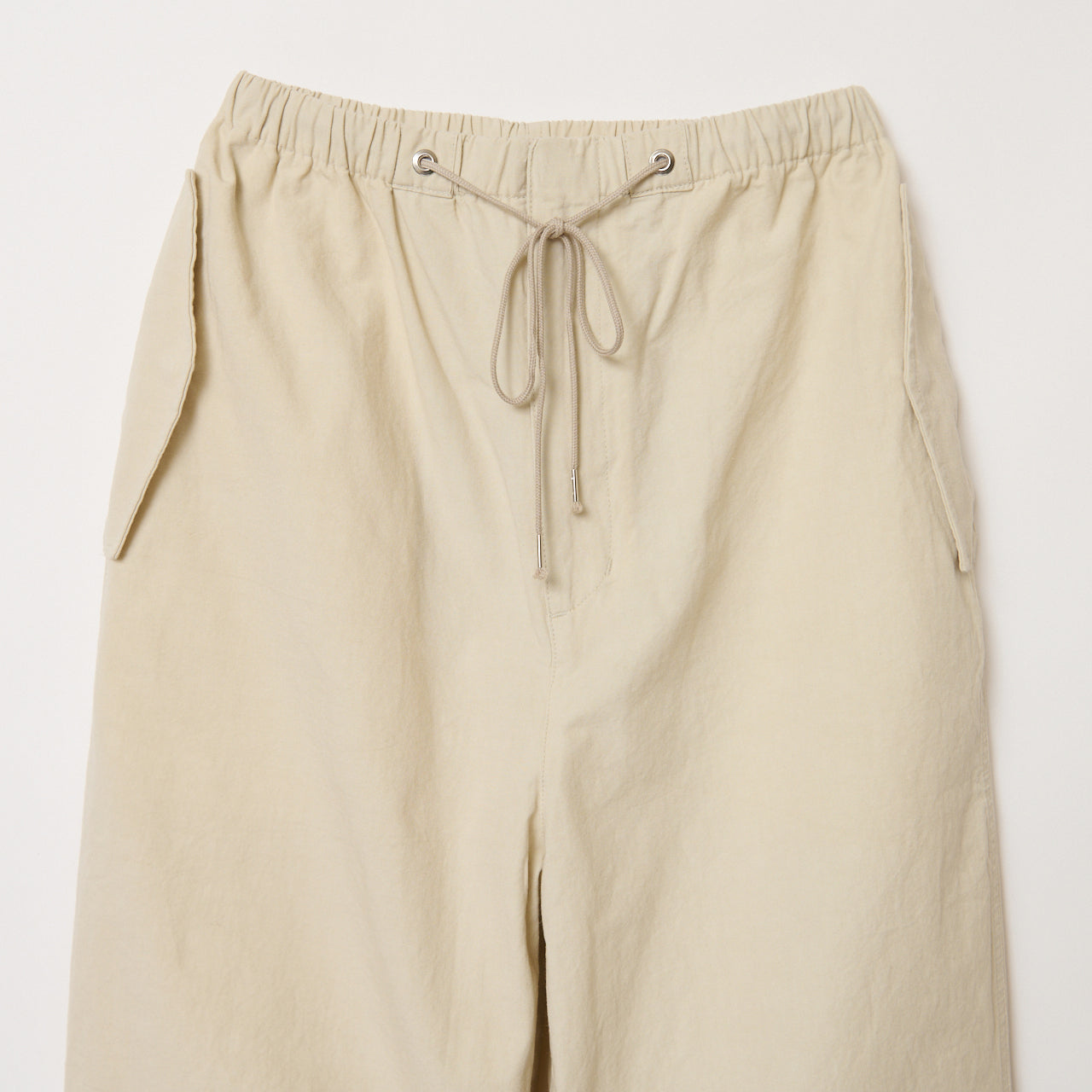 飾りフラップの後ろにストレートポケット。ウエストと裾は引紐が通っており、絞って着用するドローストリング仕様です。
