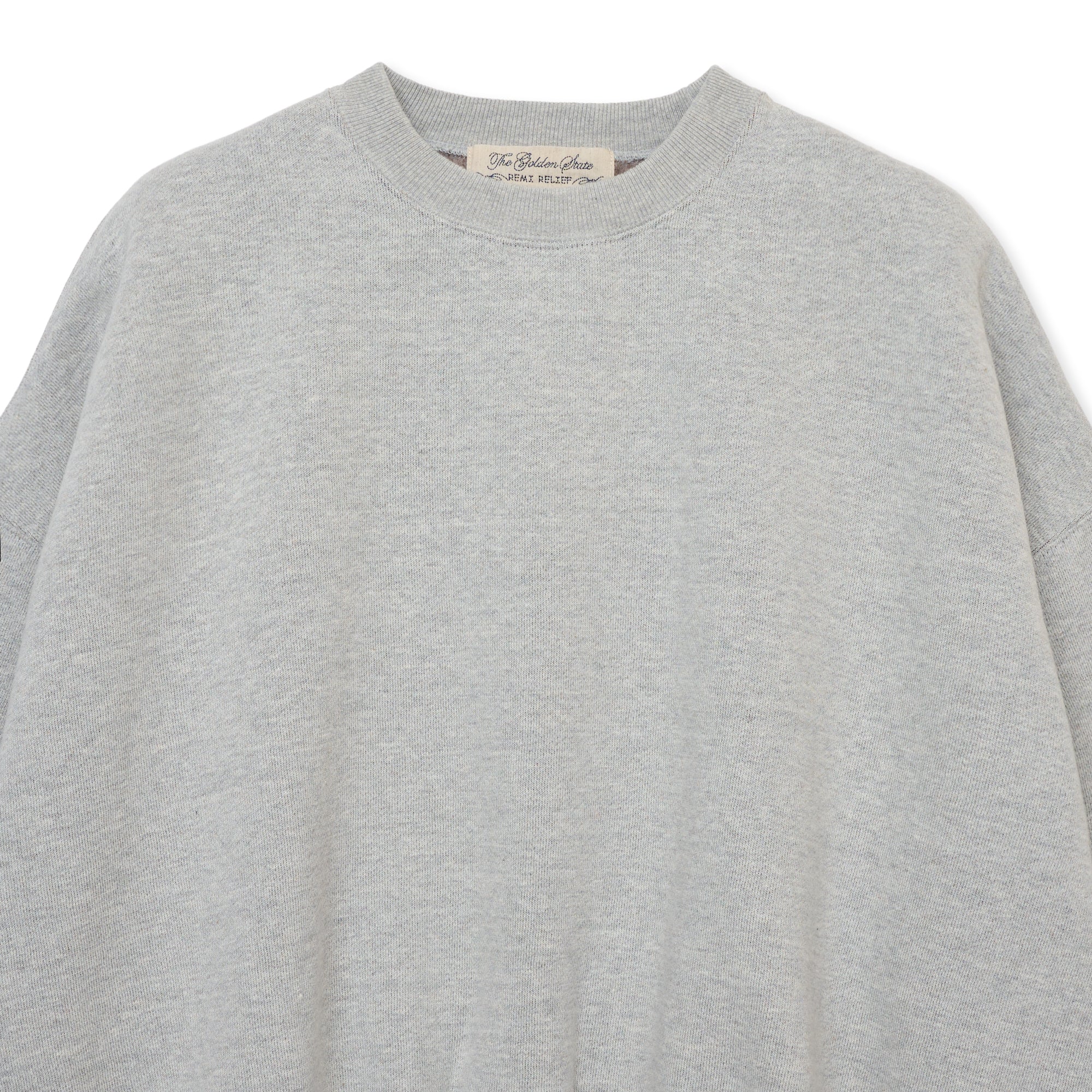 「究極なアメリカンベーシック」を追求するブランド"REMI RELIEF"とのダブルネームで制作。裏糸に特殊な紡績糸を使用。この糸は、紡績や織布の工程で発生する糸くずや布地、または未使用のまま廃棄される繊維原料を集めて反毛(綿にほぐし直すこと)し、再び糸として紡いだリサイクル素材です。さまざまな種類の糸が混ざり合うことで、独特の柔らかさと風合いが生まれています。